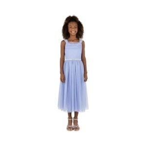 Girls Sleeveless Scoop Neck Tulle Midi Dress with Embellished Waist