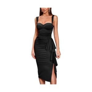 Bodycon Midi Dress for Women Mesh Puff Sleeve Slit Work Cocktail Wedding Dresses with Belt
